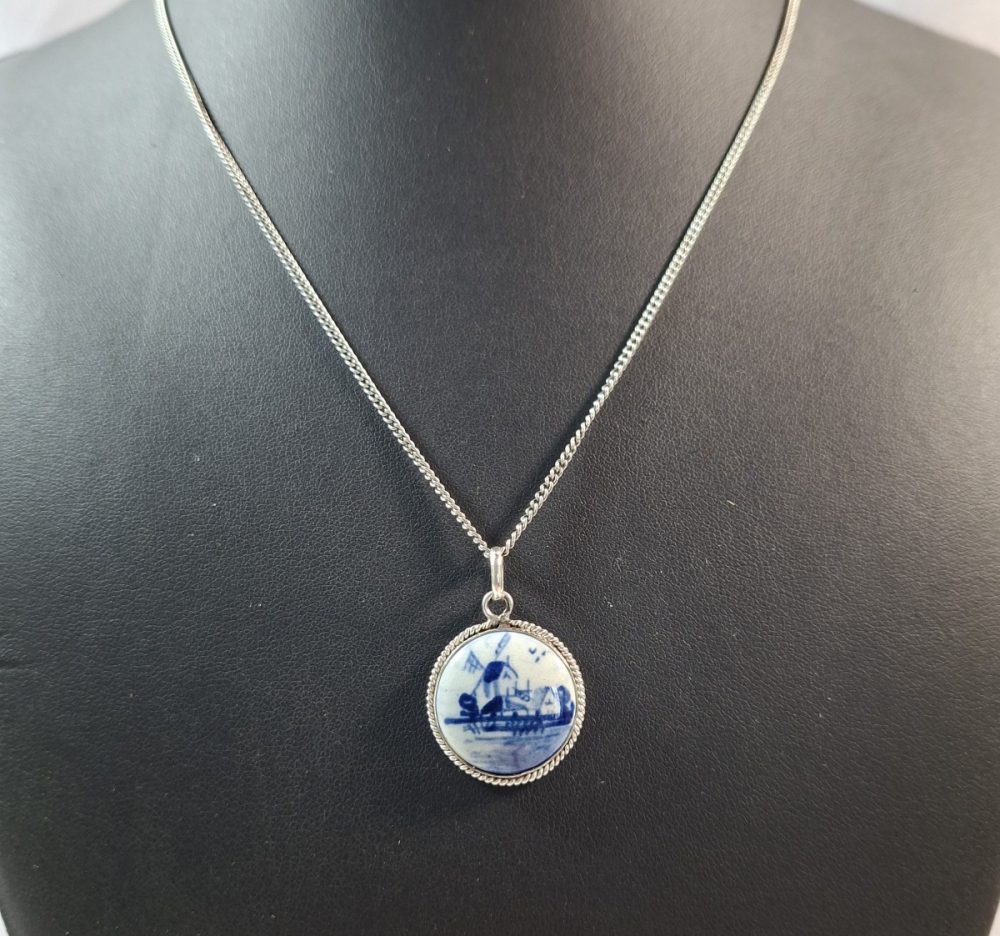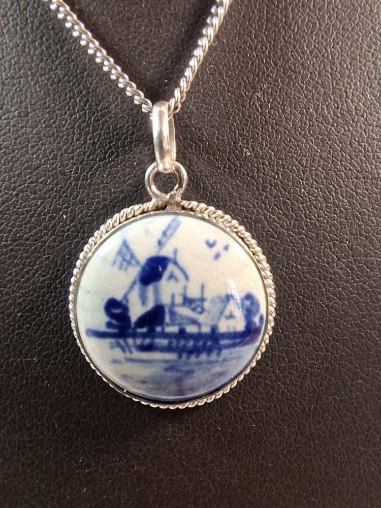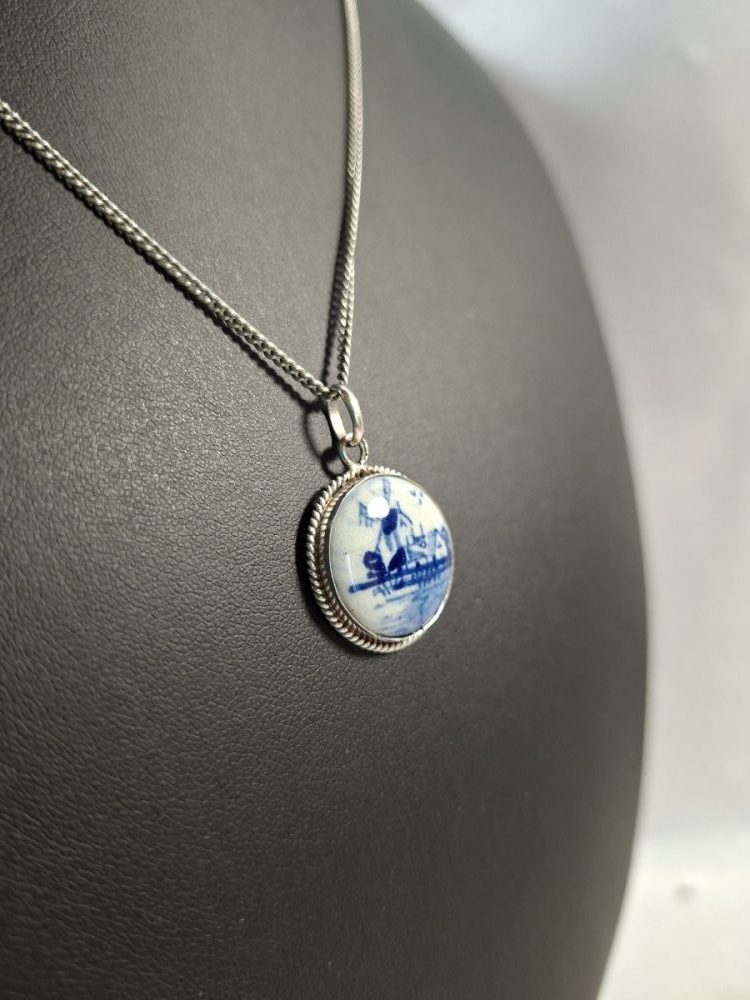 Leuke zilveren ketting met een Delftsblauwe hanger in zilver montuur.