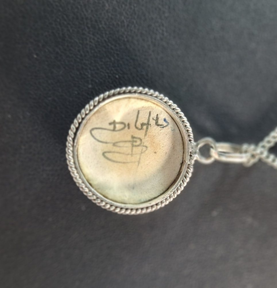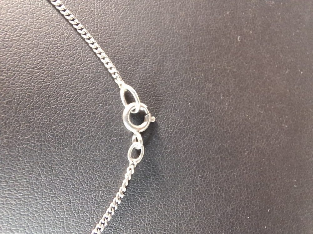 Lengte ketting 42 cm, hanger 1.8 cm. In uitstekende staat.